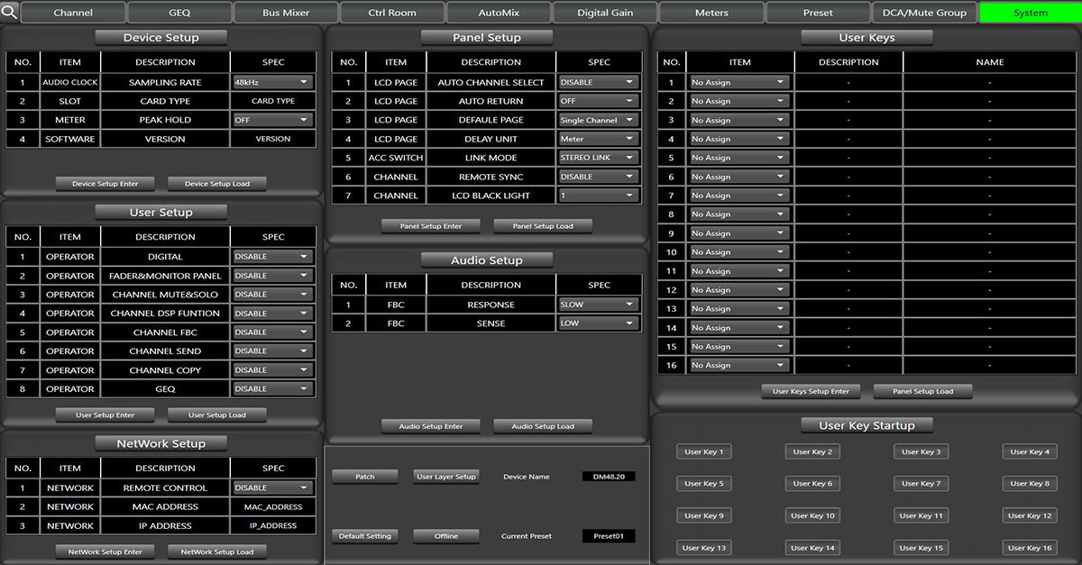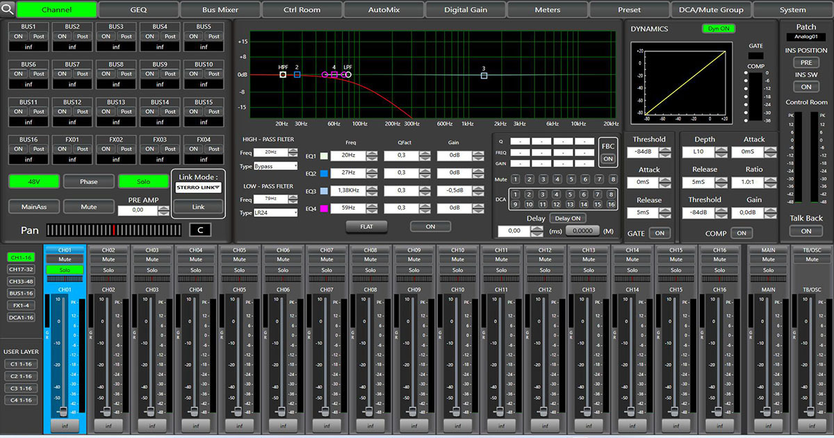 Вся информация выводится на 10,1-дюймовый цветной сенсорный ЖК-дисплей высокой чёткости с разрешением 1024×600, а также на 17 двухцветных служебных дисплеев и 100-мм моторизированных фейдеров.
